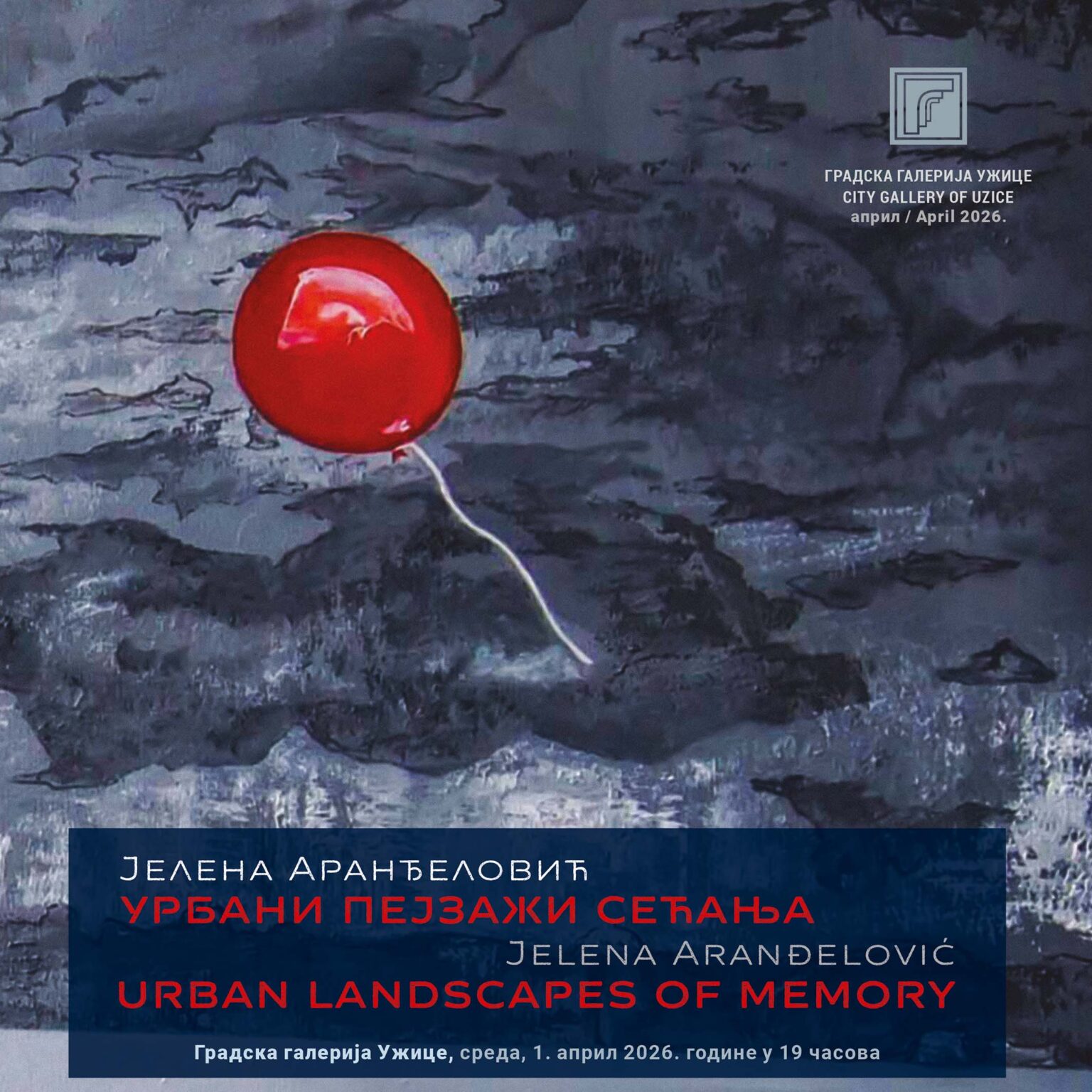 Izložba “URBANI PEJZAŽI SEĆANJA” beogradske autorke Jelene Aranđelović biže otvorena u Gradskoj galeriji Užice 1. aprila 2026. godine u 19 časova.